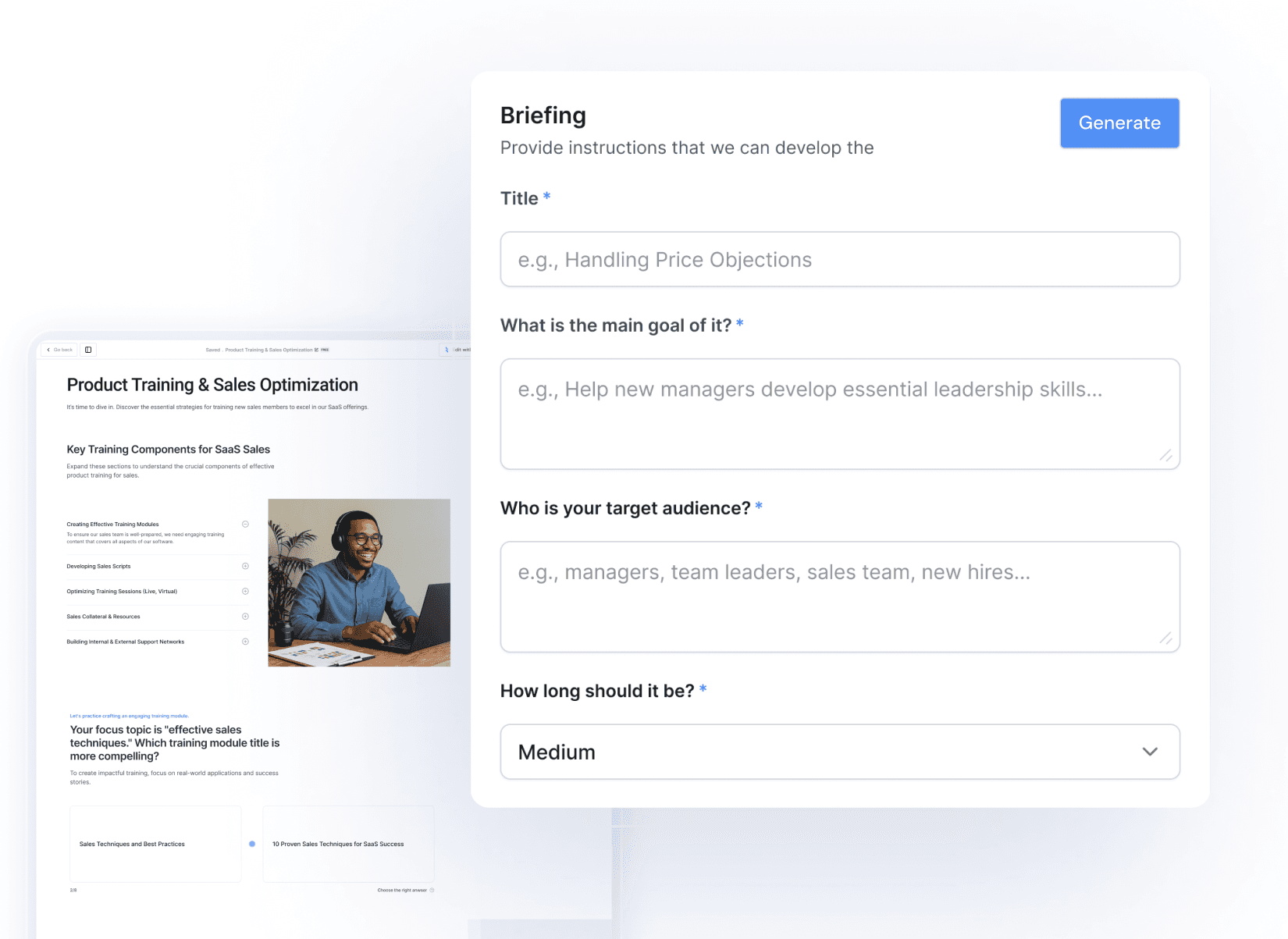Explore Deelan's powerful generations designed to help you generate structured, customizable trainings in minutes.