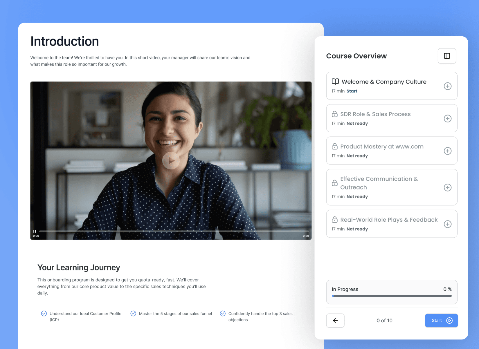 Automate the "First Week" experience. Create consistent, trackable onboarding courses that ensure every new hire understands your culture and product.
