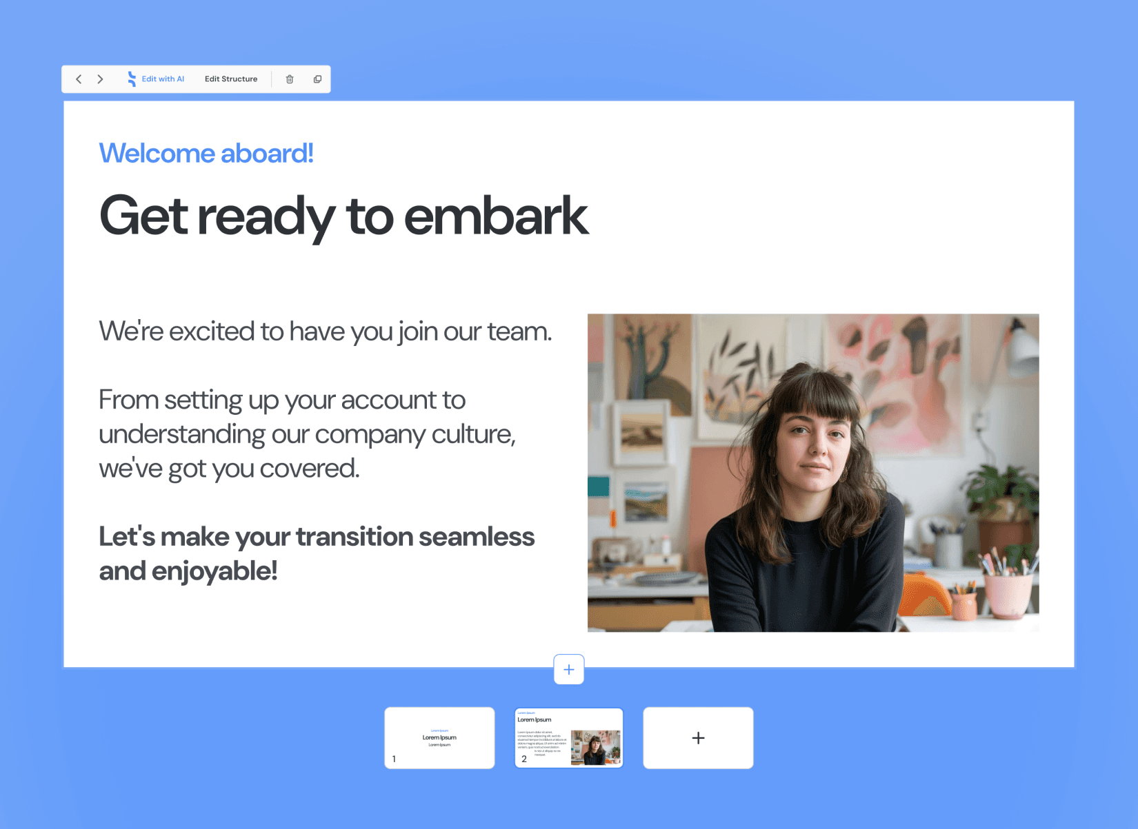 Zero prompting, zero design. Fill essential information step by step and let our AI take the lead.