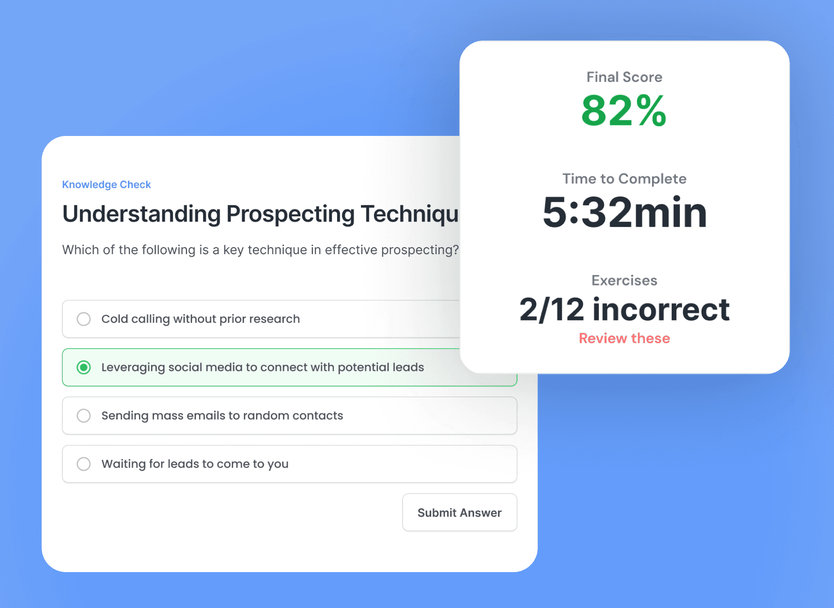 Generate dedicated knowledge check with multiple exercises, quizzes with certifications that reveal real skill gaps, not just completion.