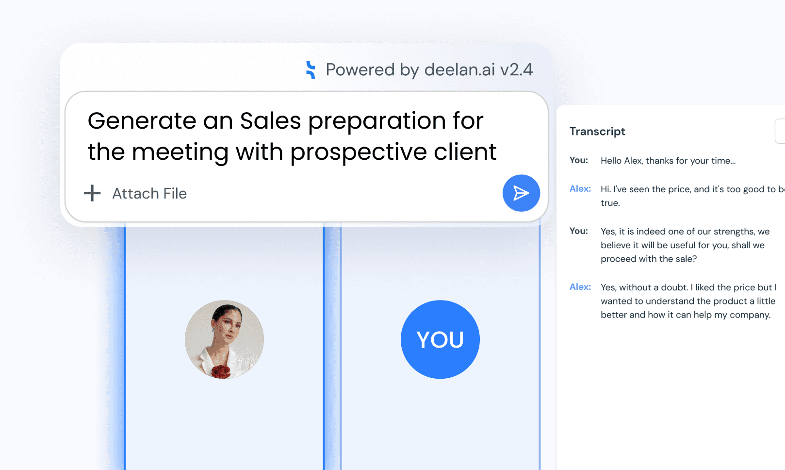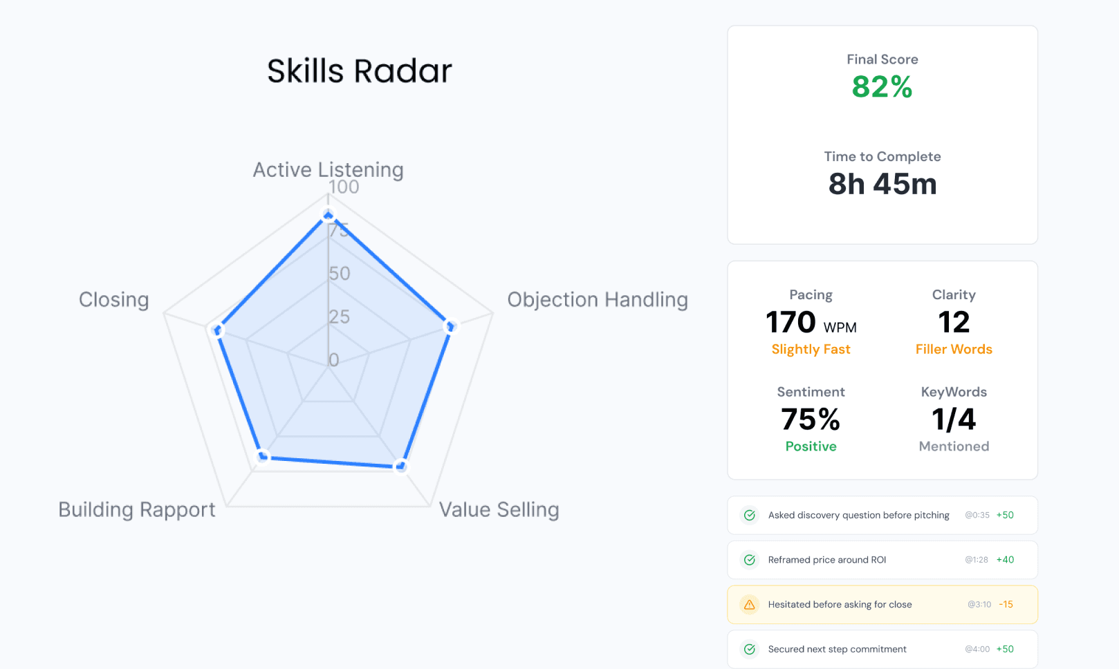 Analyze not only what was said, but HOW it was said. AI provides a report about talk-to-listen ratio, objection handling, question depth, level of confidence, tone, silence points, eloquence.
