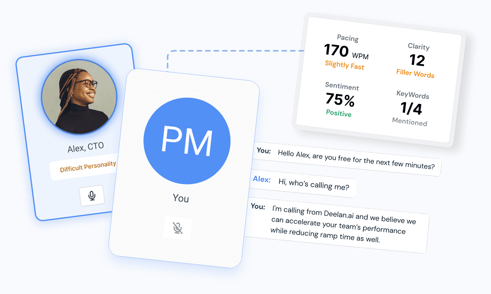 Generate simulations to practice real-time scenarios with realistic AI conversation in minutes with an AI roleplay of Deelan. Unlimited reps. Zero burned prospects.