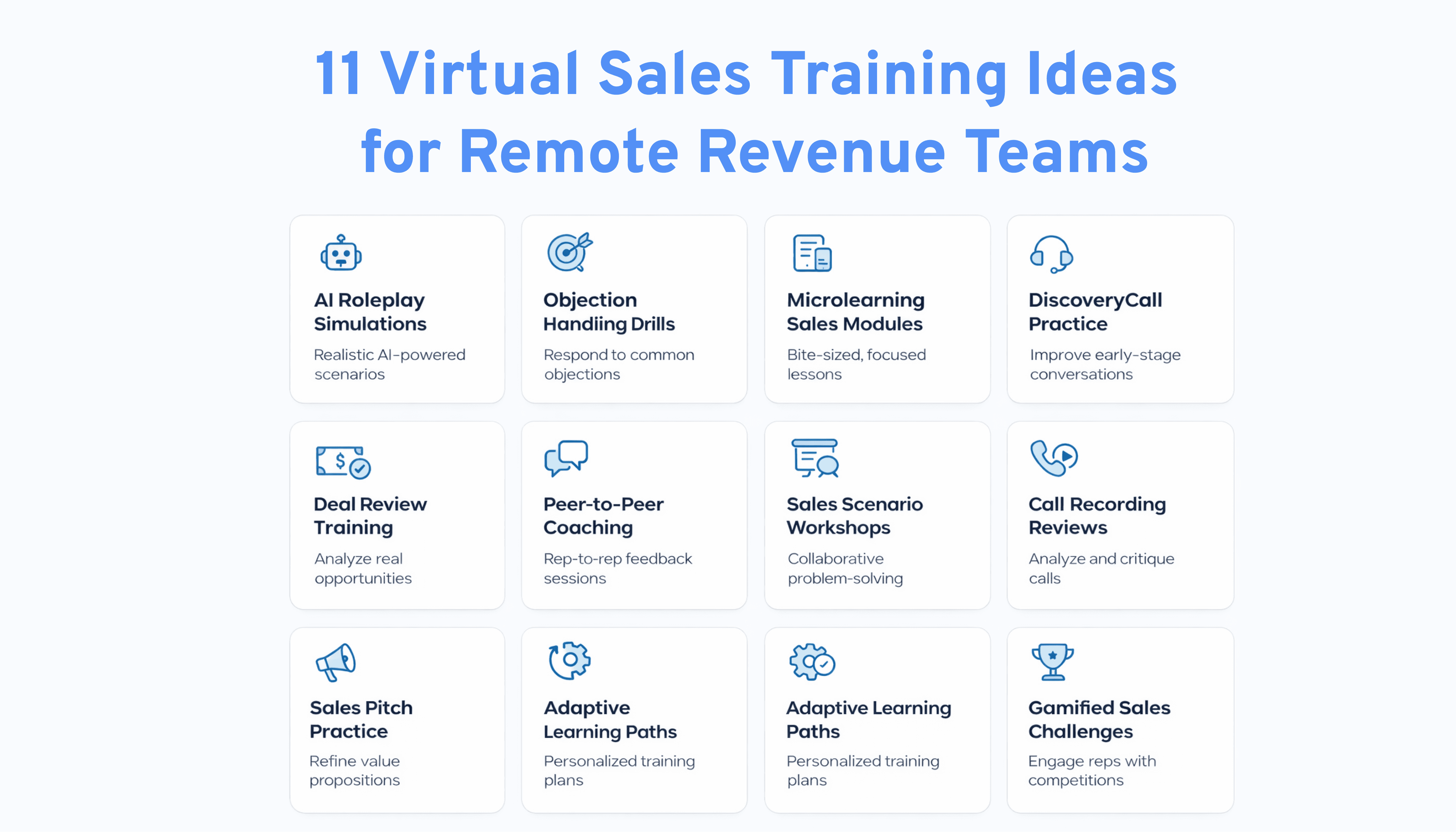 Discover 11 practical virtual sales training ideas to improve remote sales team performance, engagement, and skill development with modern training methods.
