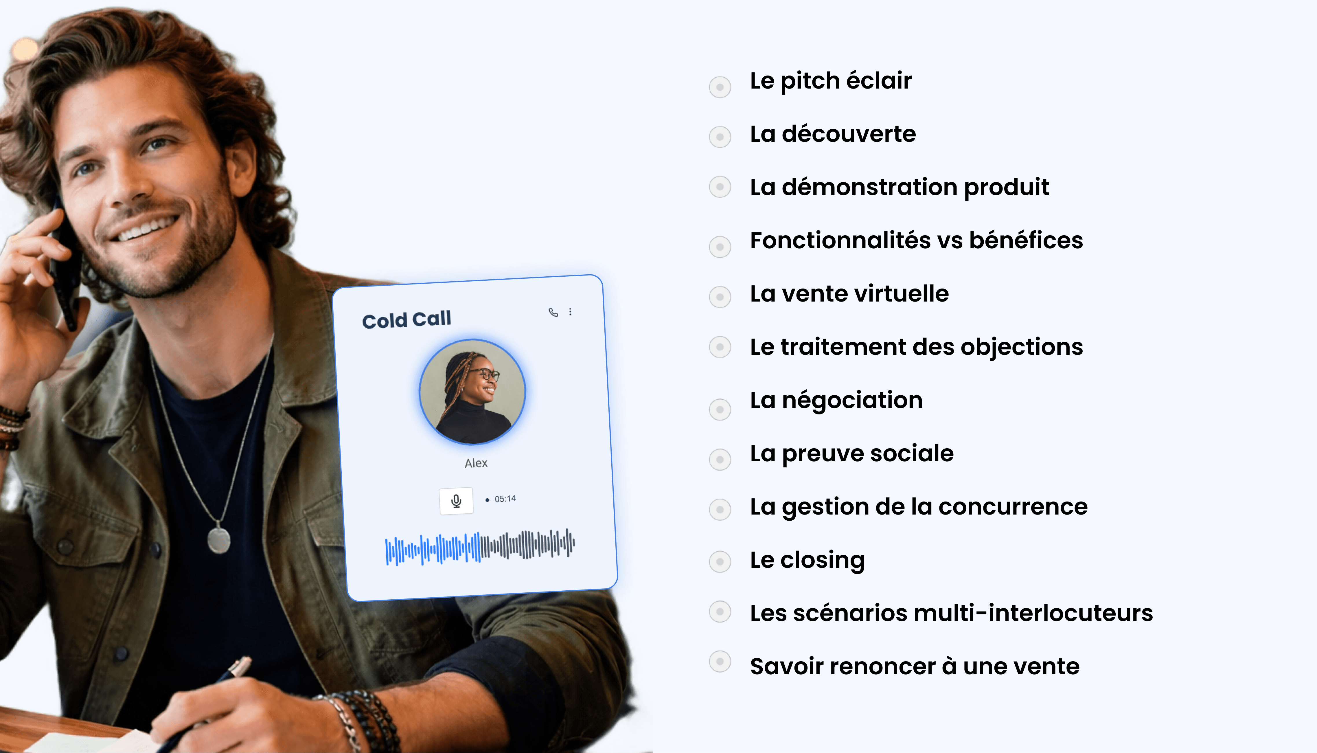 Conseil de pratique : Entraînez plusieurs techniques de closing : alternatif (« Vous préférez démarrer en janvier ou en février ? »), par récapitulatif (« On a validé X, Y, Z — passons à la suite »), ou progressif (valider des petits "oui" intermédiaires). Deelan permet de configurer des simulations spécifiquement orientées closing, avec des personas à différents niveaux de résistance.