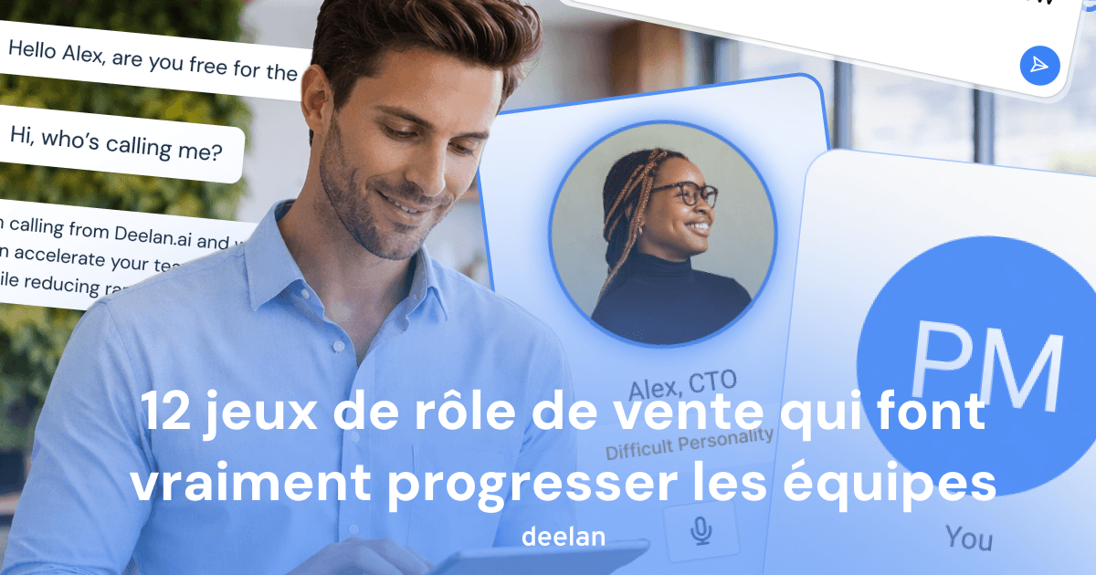 C'est là que l'IA change la donne. Avec une plateforme comme Deelan, vos commerciaux peuvent pratiquer ces 12 scénarios à tout moment, sans dépendre de la disponibilité d'un manager. Chaque simulation génère un feedback instantané — temps de parole, gestion des objections, clarté du pitch, radar de compétences — et les données sont centralisées pour les responsables commerciaux.