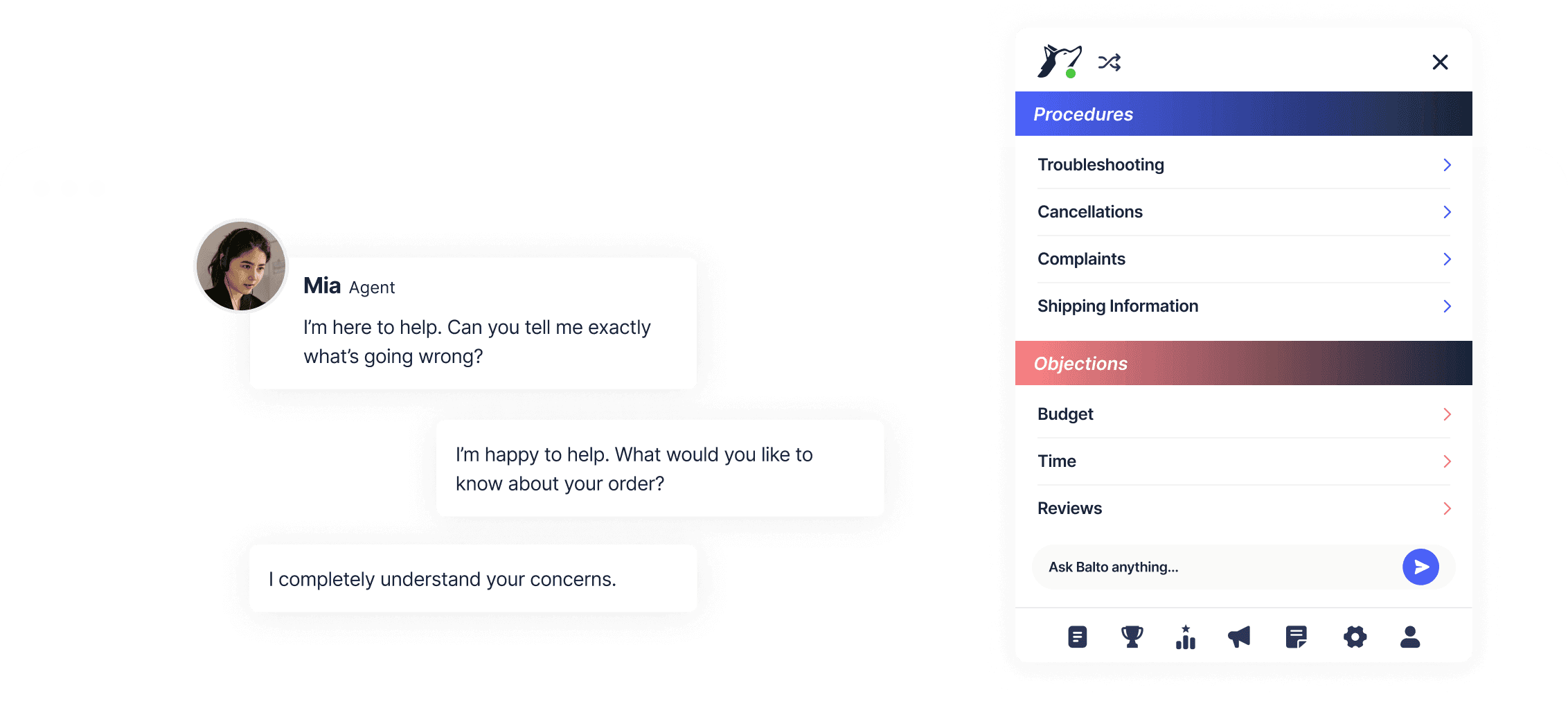 Tools like Balto display suggested responses or checklists when certain topics arise.