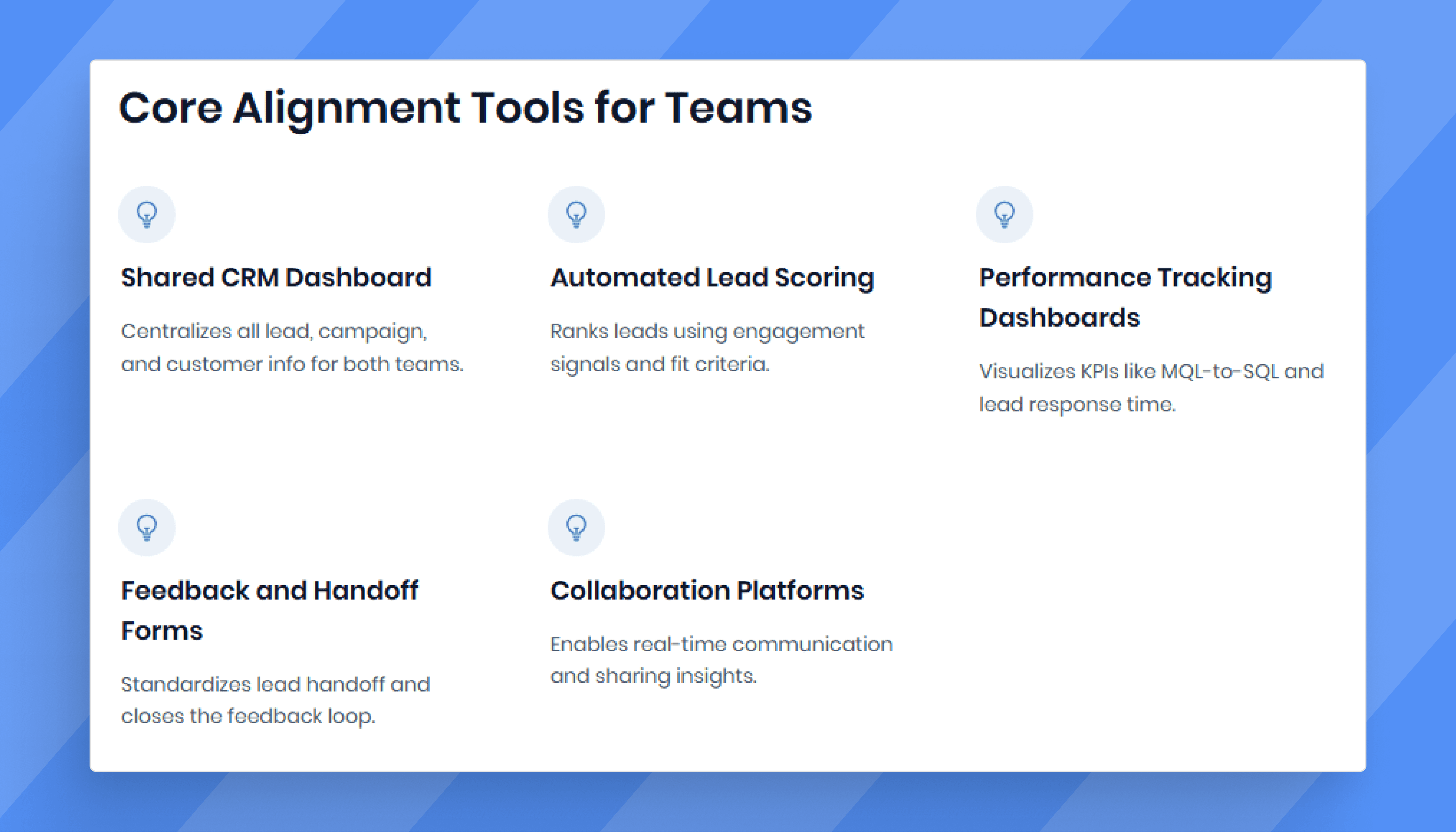 A reliable CRM is the single source of truth that makes everything else possible. Both sales and marketing must use it consistently. Layer in marketing automation that feeds into CRM records, so sales reps can see engagement history without switching tools.