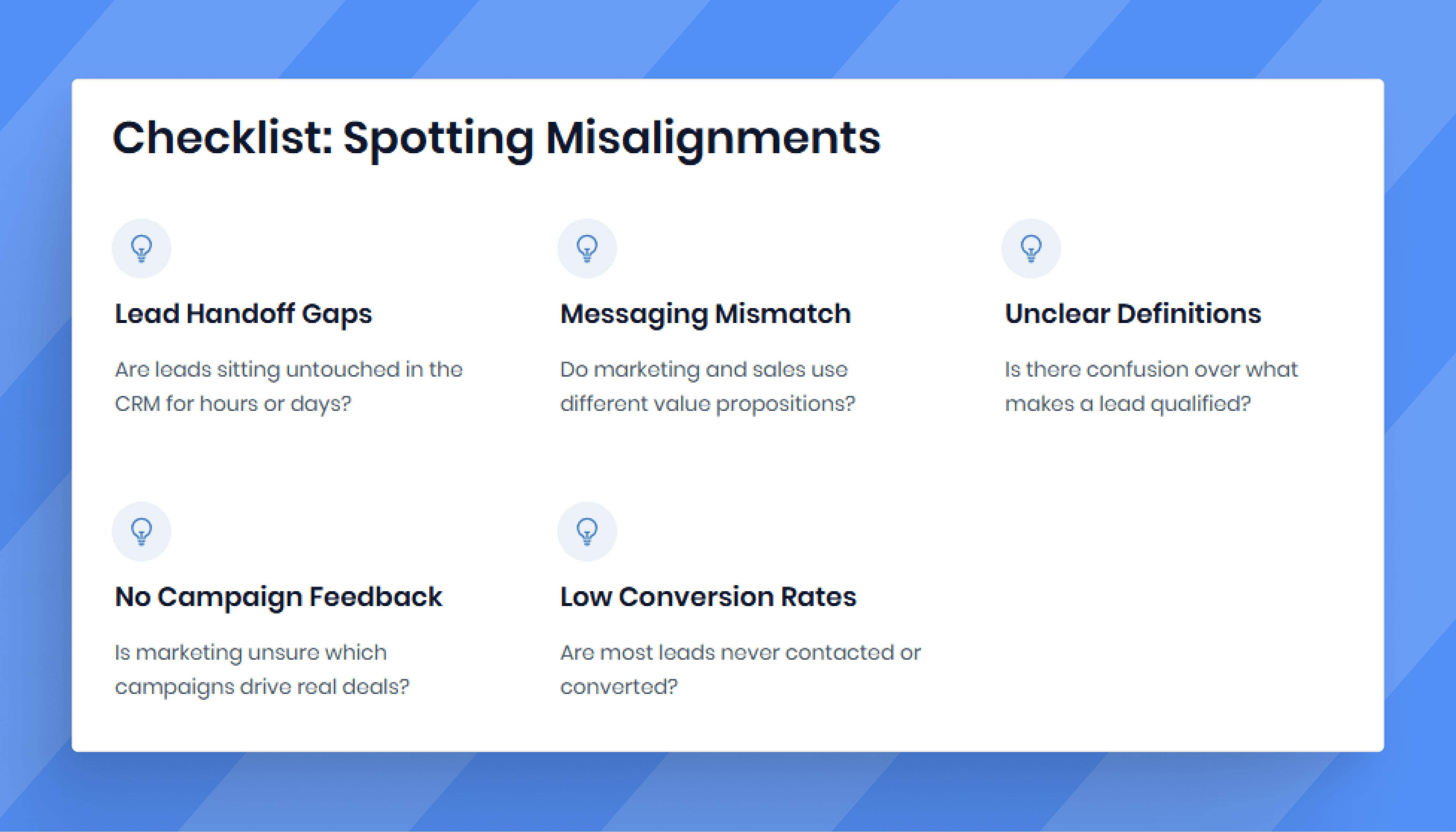What are the biggest signs of sales and marketing misalignment? Key indicators include: sales teams ignoring marketing-generated leads; marketing producing content that sales never uses; prospects receiving contradictory messaging from the two teams; long lead response times; and each team blaming the other when revenue targets are missed.