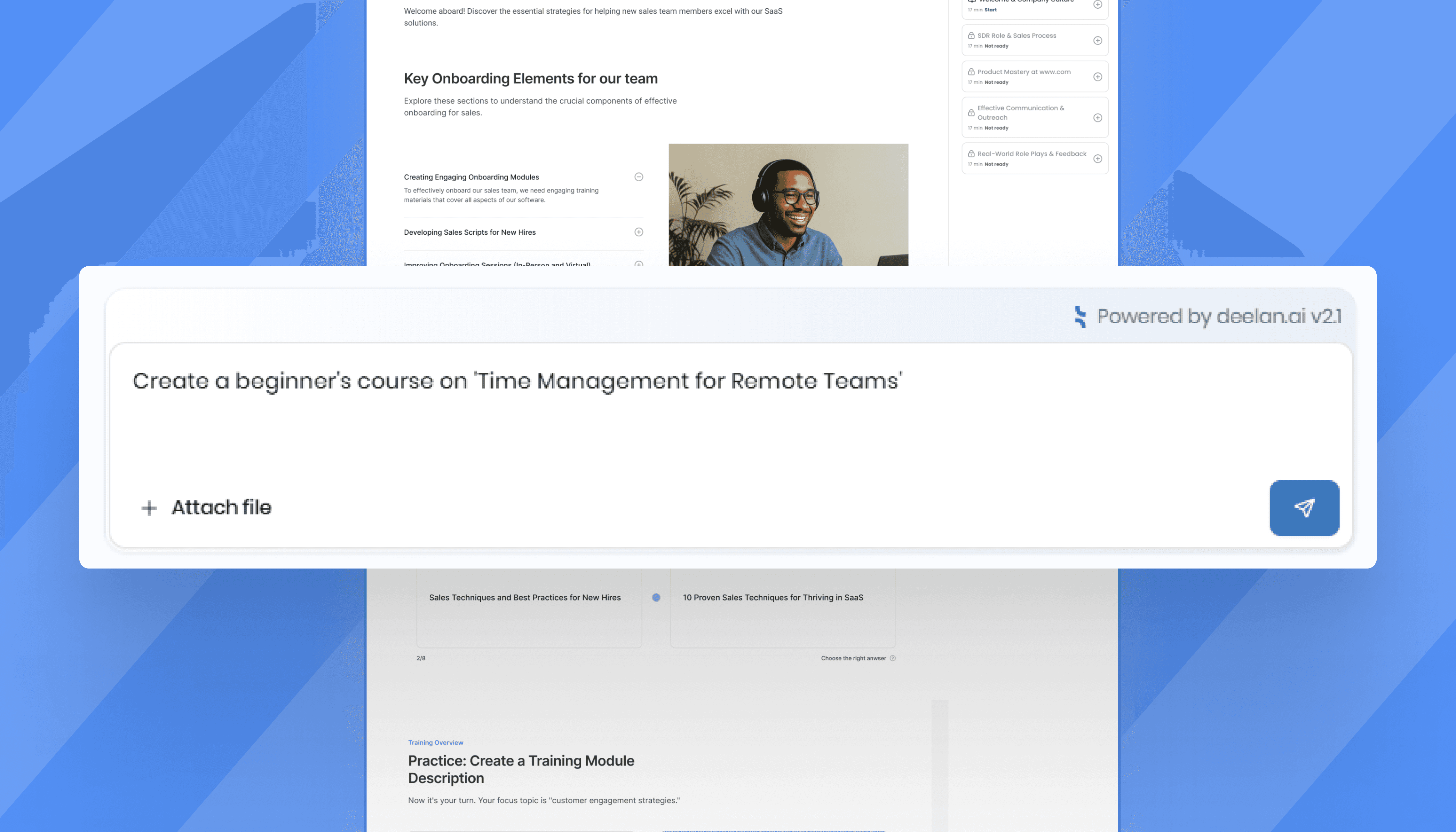 Upload playbooks, PDFs, training documents, product specs, recordings or just write your prompt.