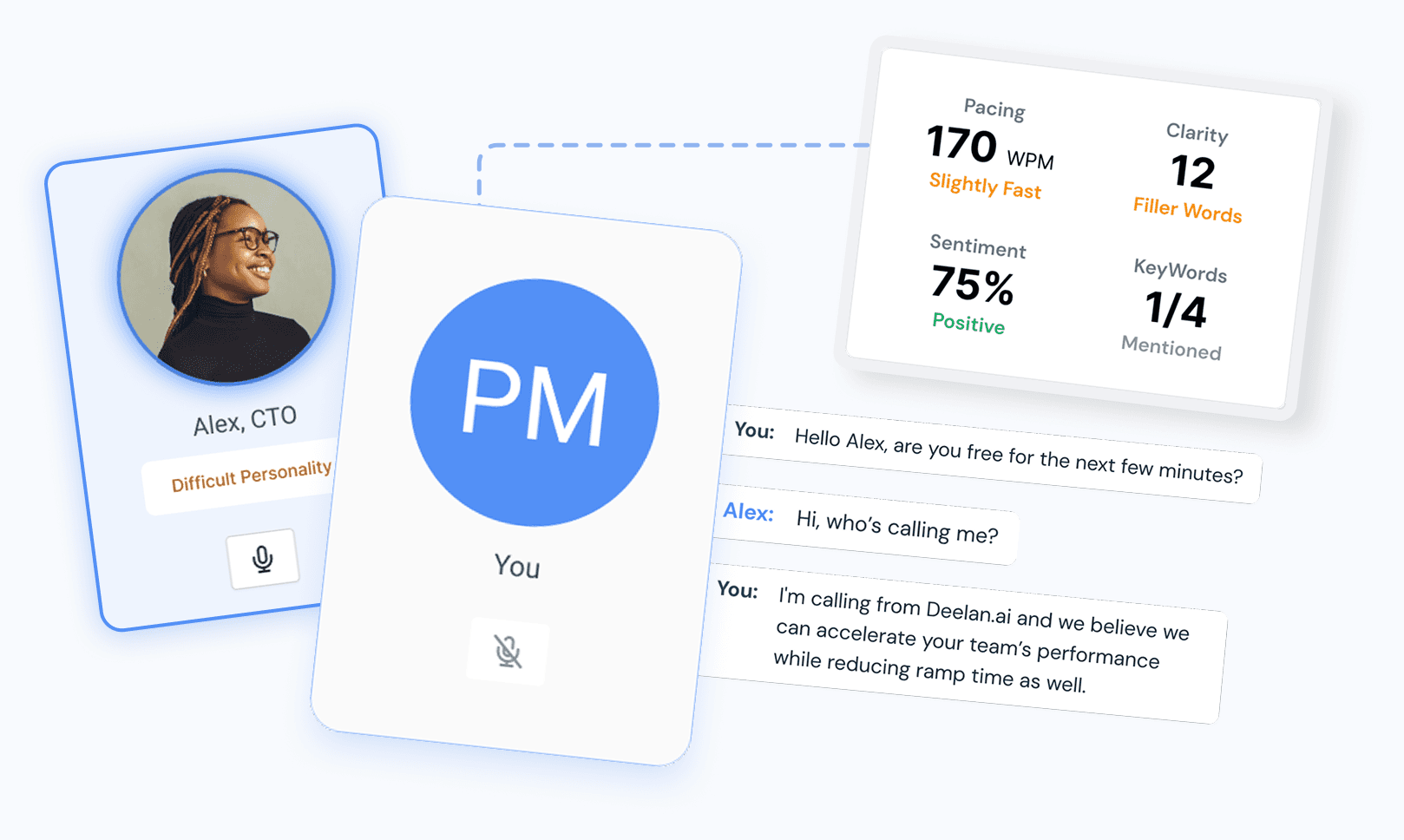 Deelan provides AI-powered roleplays that act as a flight simulator for revenue teams. Reps engage with a realistic AI persona that responds to their specific words, tone, and logic. Because the learning is adaptive, the AI buyer can become more or less difficult based on the rep's progress..