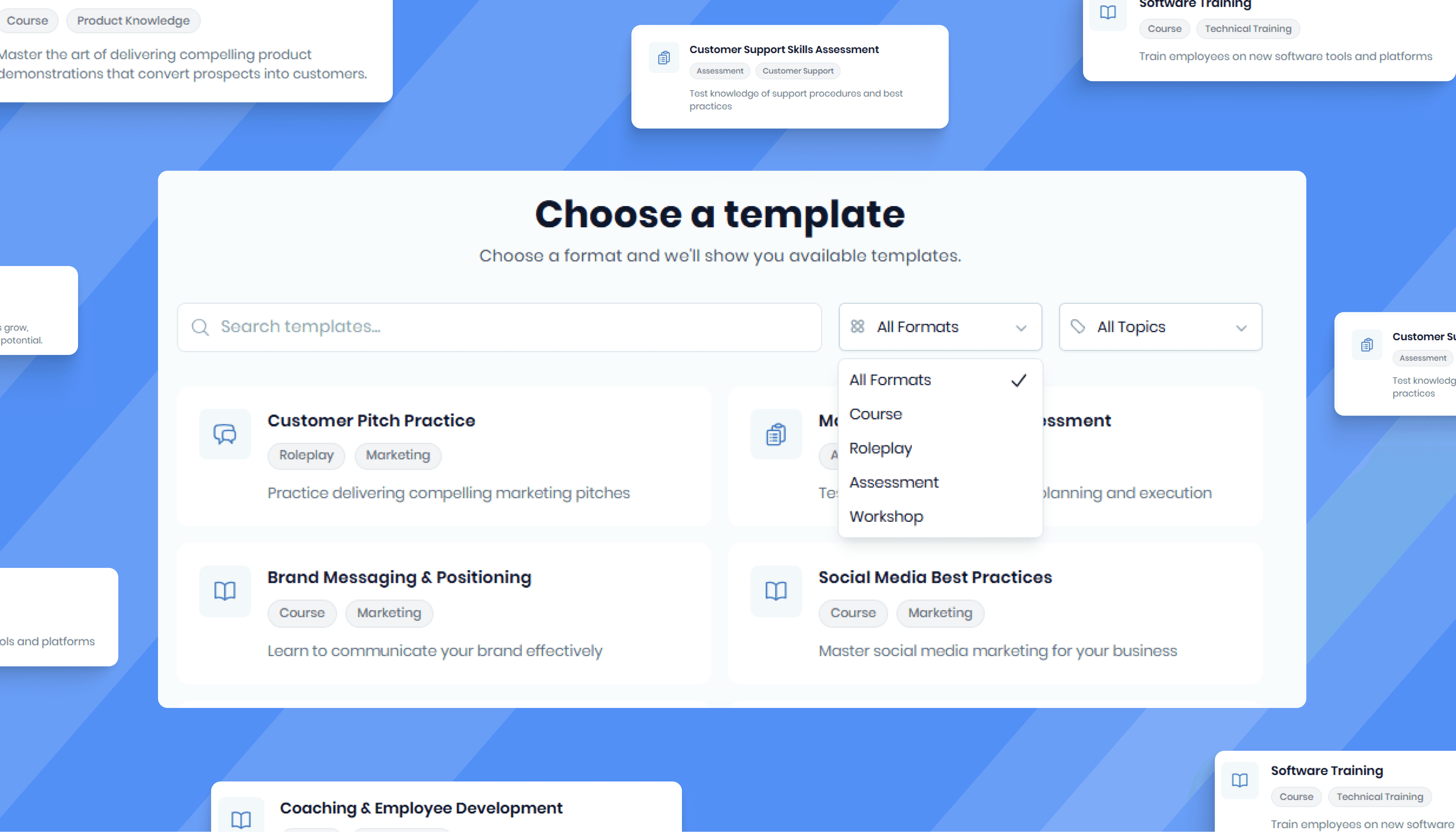 Create courses, workshops, roleplays, assessments, microlearning, and full programs from a single platform.