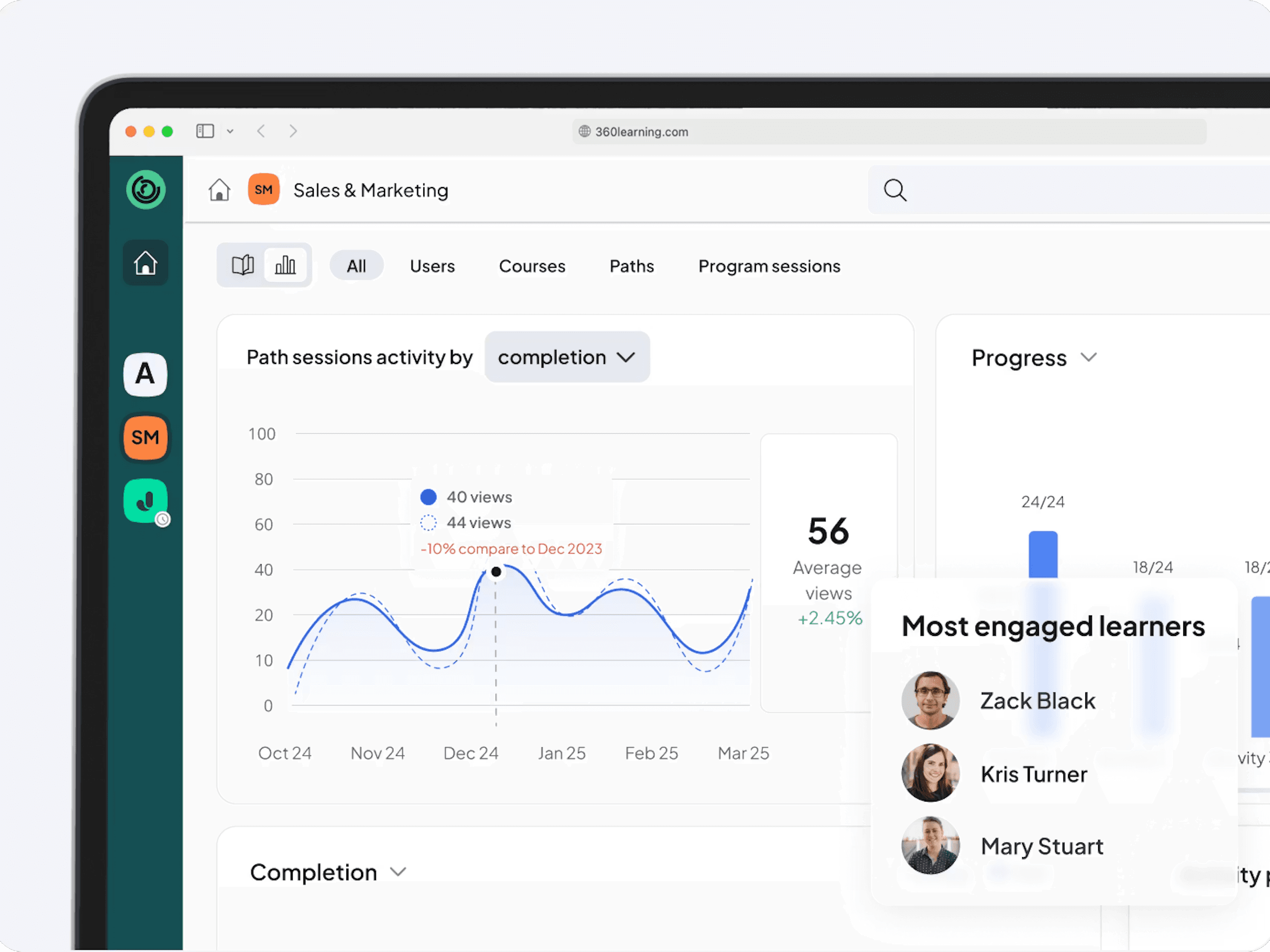 360Learning takes a collaborative approach to enablement: rather than top-down content delivery, the platform is designed to turn in-house experts into training contributors. Sales teams create, refine, and share knowledge within the platform, and the AI-powered Skills features push targeted upskilling into reps' flow of work.