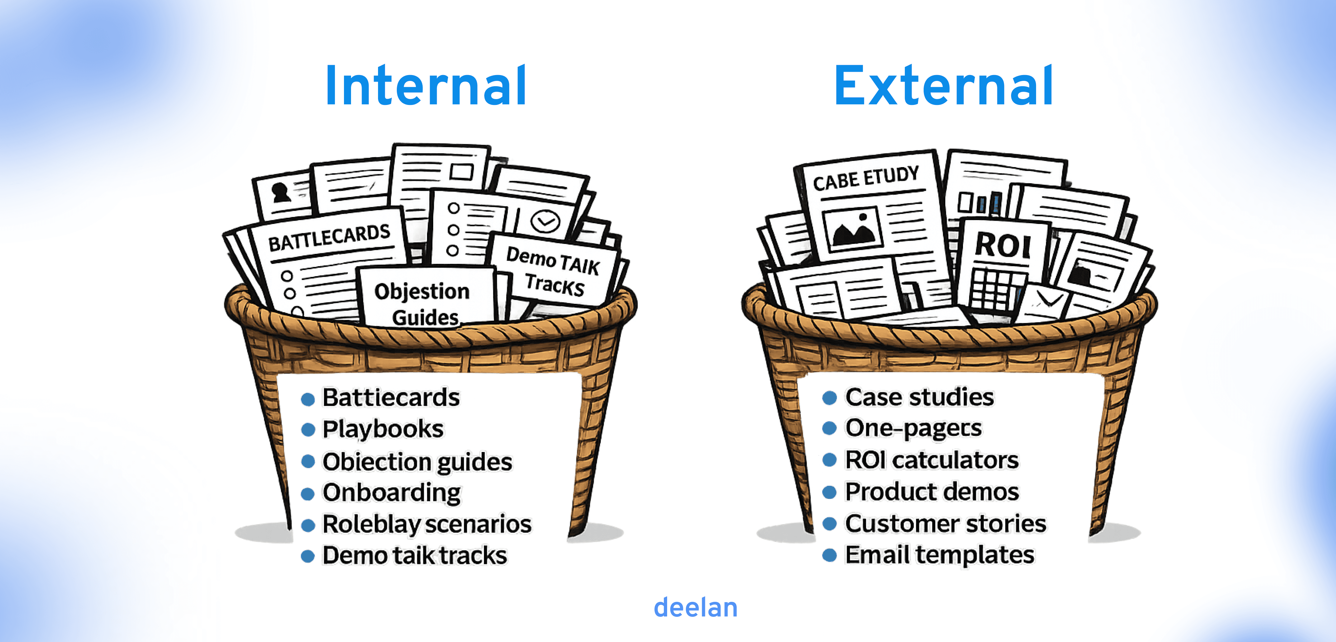 Internal | Sales reps, SDRs, AEs, CSMs, managers | Build skills, knowledge, and confidence | Battlecards, playbooks, objection guides, onboarding, roleplay scenarios, demo talk tracks |
