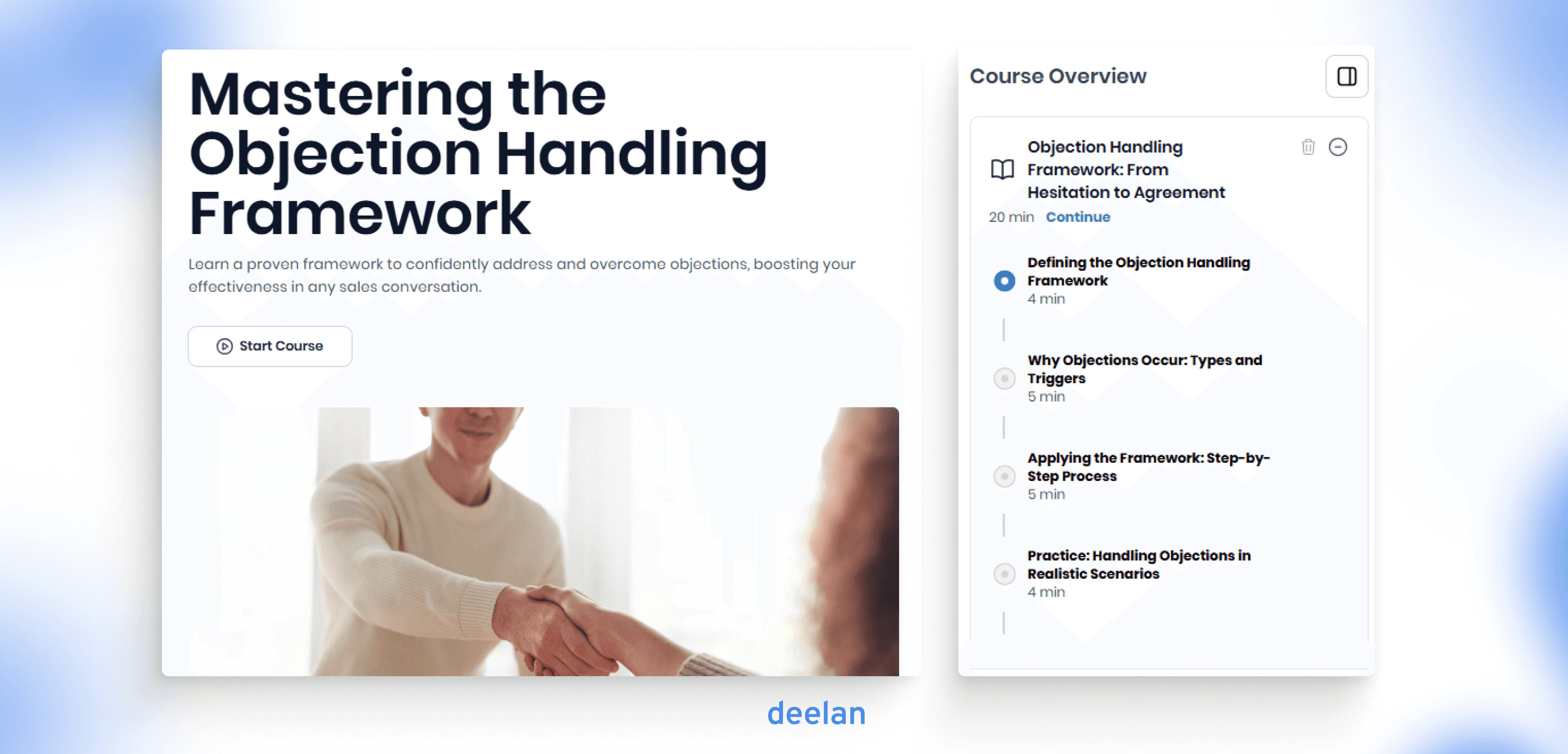 Deelan takes your existing sales content, documentation, and call recordings and converts them into interactive training experiences: roleplays, microlearning modules, quizzes, onboarding paths, and certifications.