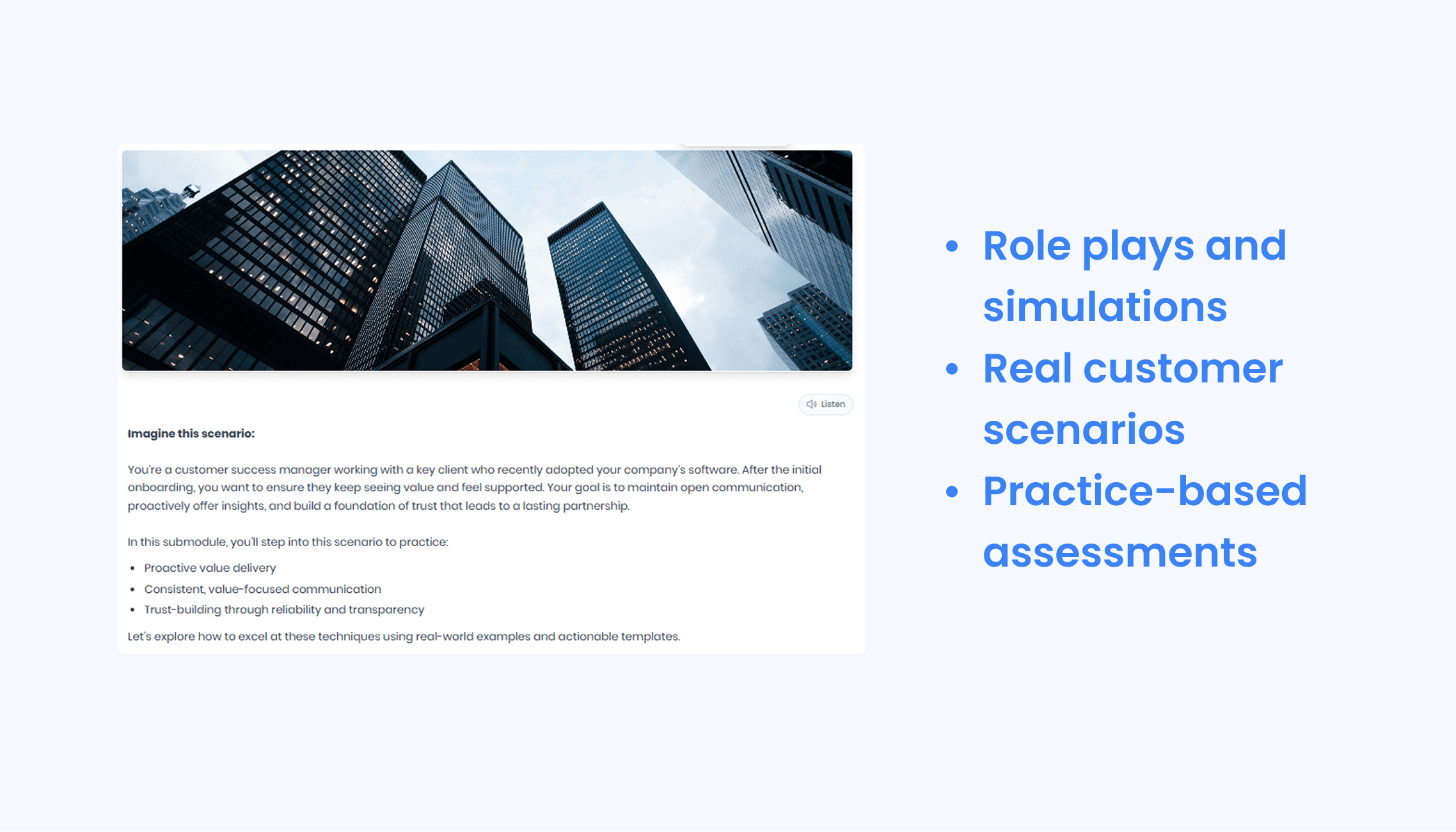 CS Onboarding: Get new hires ready to handle accounts in days, not weeks, with guided simulations.