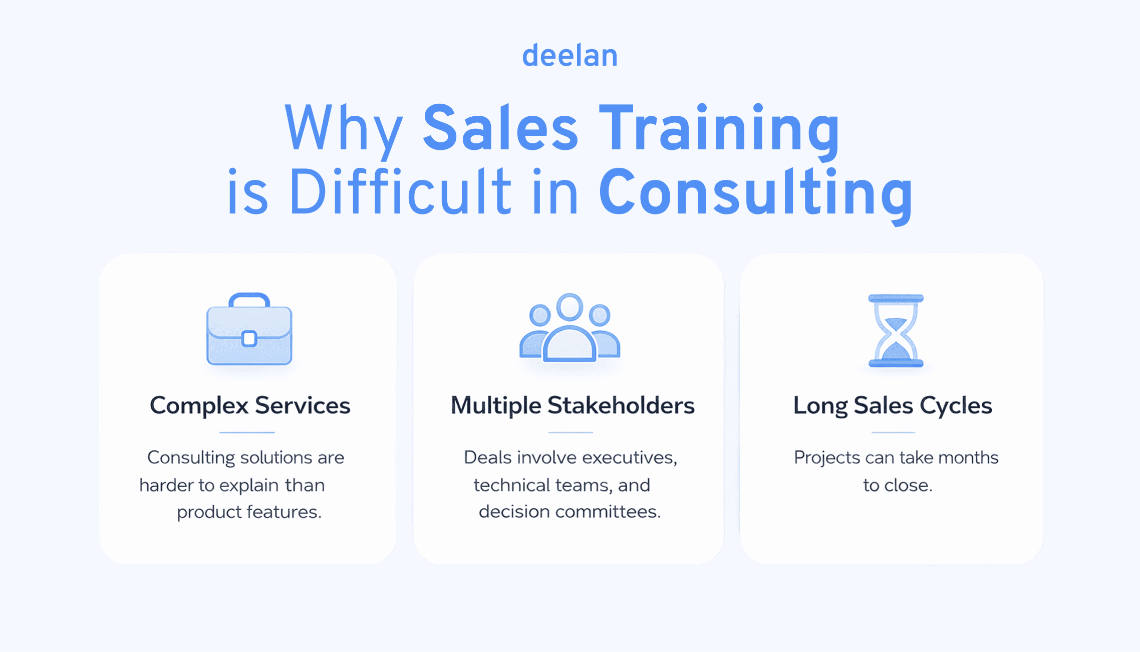 However, training sales teams in consulting firms presents unique challenges. Consulting services are complex, deals often involve multiple stakeholders, and many consultants responsible for selling projects have not received formal sales training. As a result, consulting firms are increasingly exploring AI-powered training platforms such as Deelan to strengthen their internal sales capabilities and scale coaching across their teams.