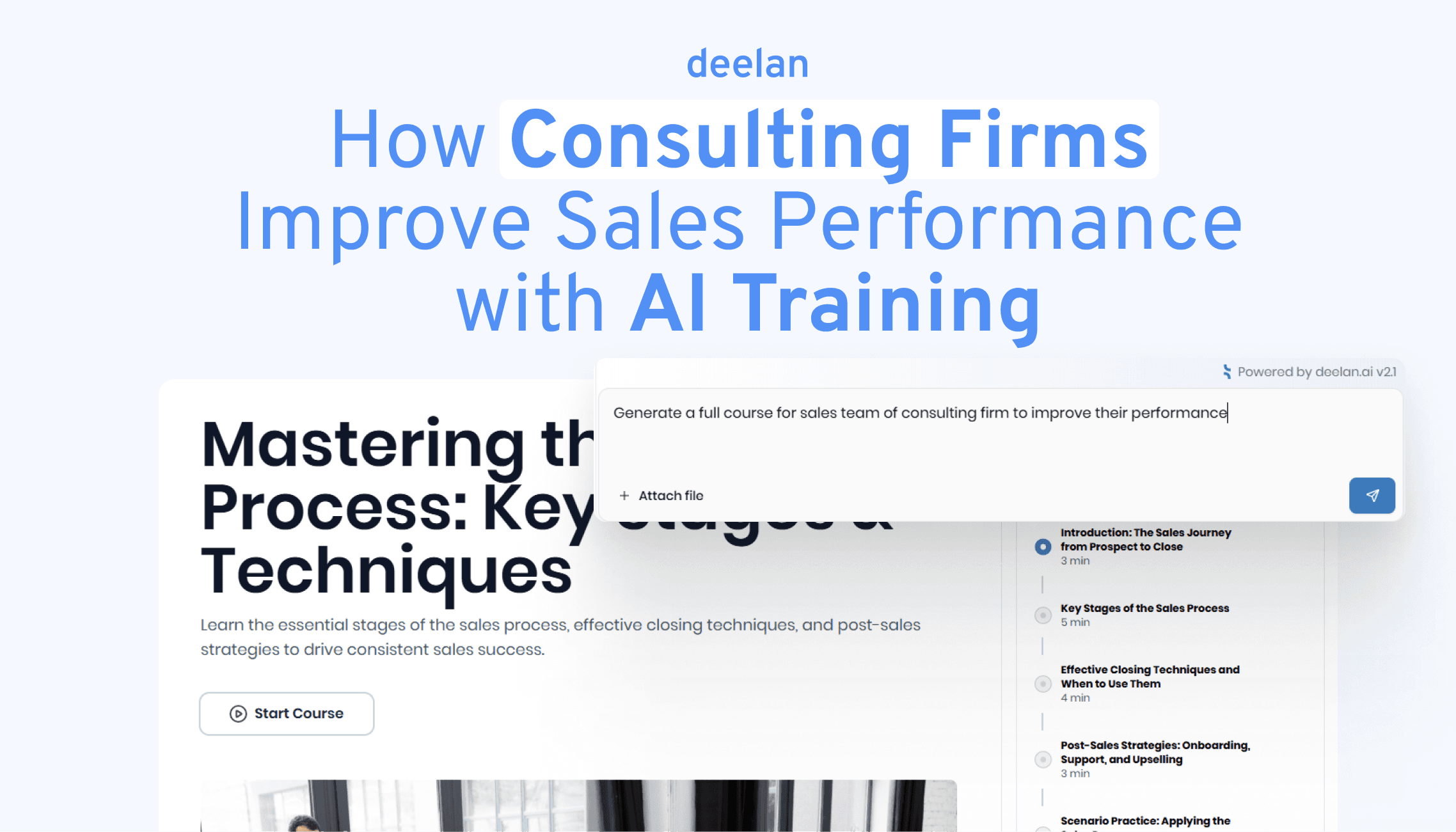 AI-powered training platforms like Deelan provide consulting firms with a way to structure, scale, and continuously improve sales skills across their organization.