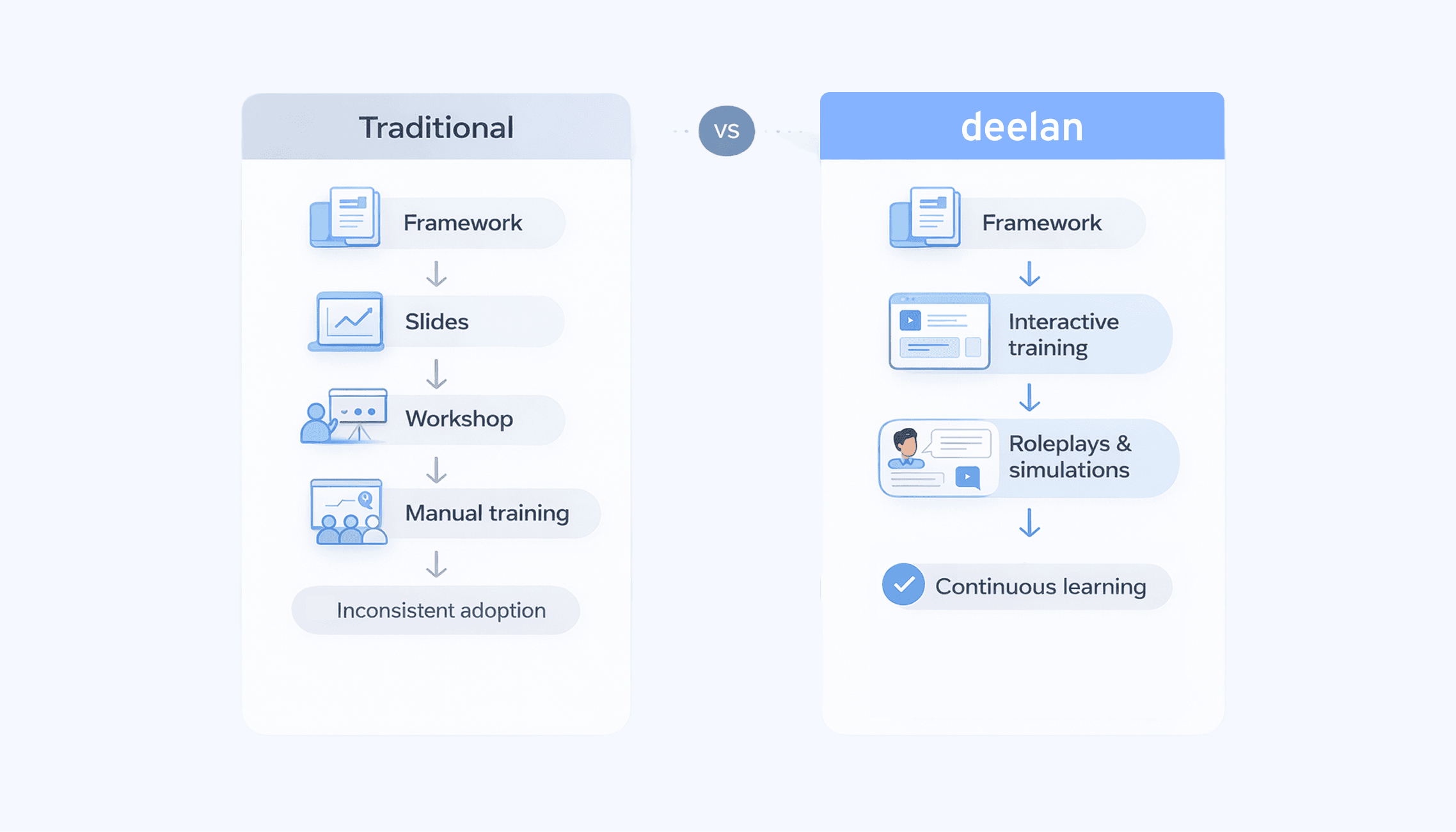 Large organizations may have hundreds or thousands of employees affected by a consulting transformation. Deelan enables consultants to deliver consistent training across distributed teams without repeating workshops.