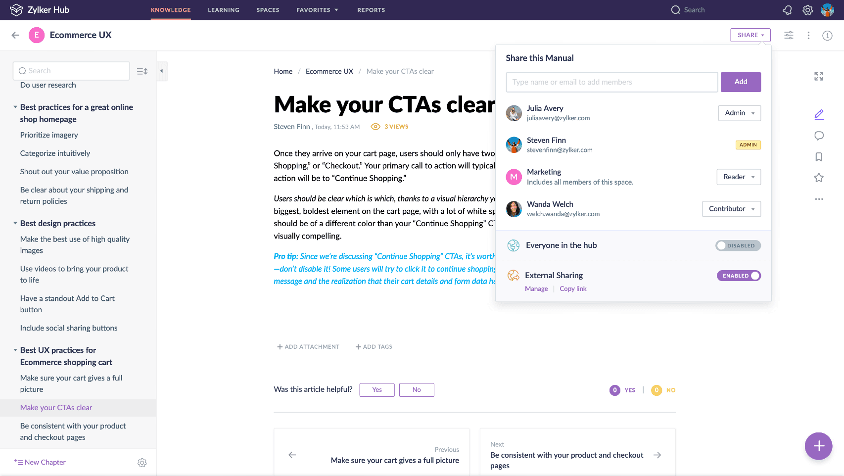 Short description: Zoho Learn combines training and knowledge base features, and it’s especially attractive if your company already uses Zoho’s ecosystem.