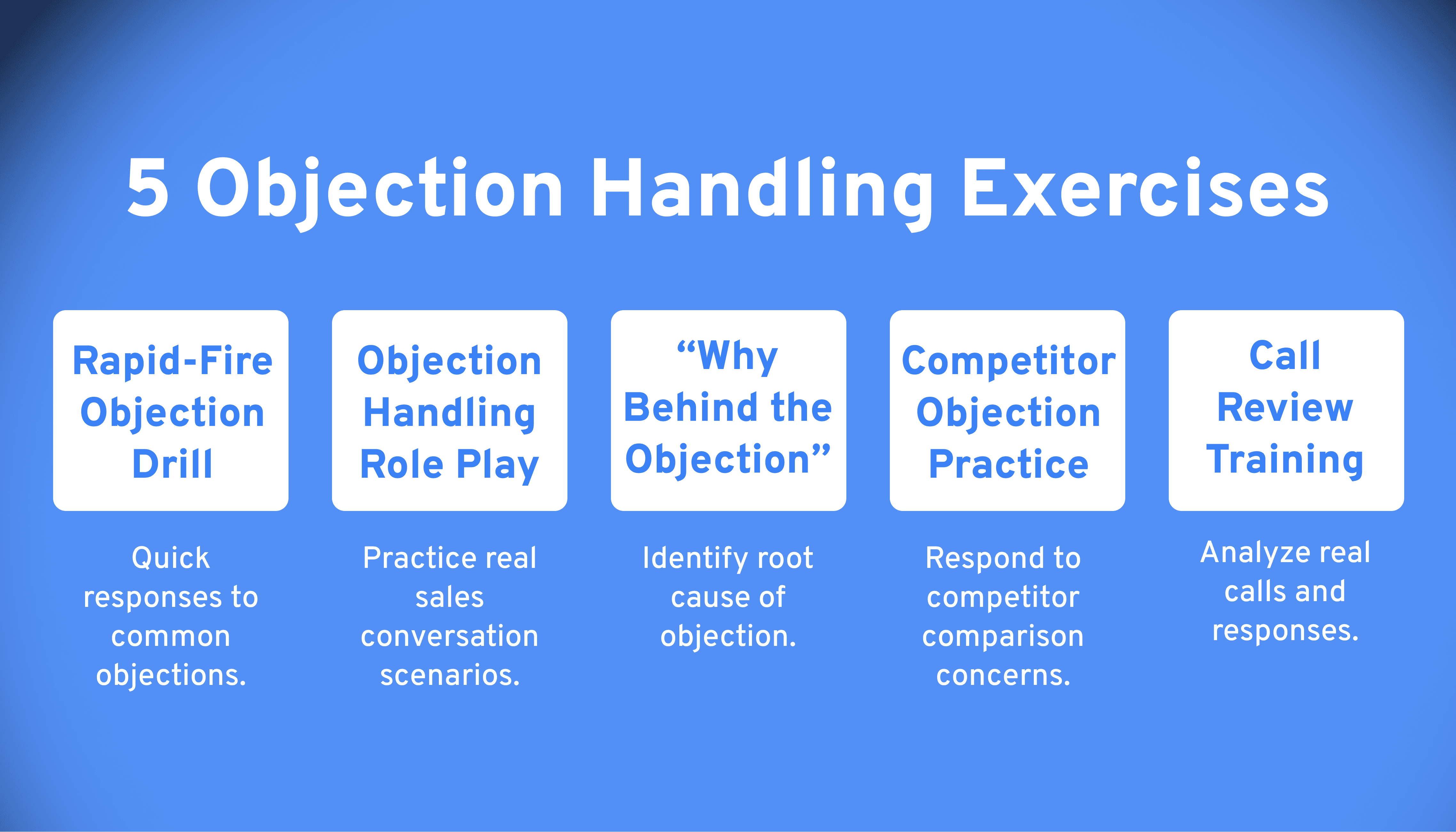 Exercises such as roleplays, rapid-response drills, competitor scenarios, and call reviews help reps improve their ability to handle objections in real time.