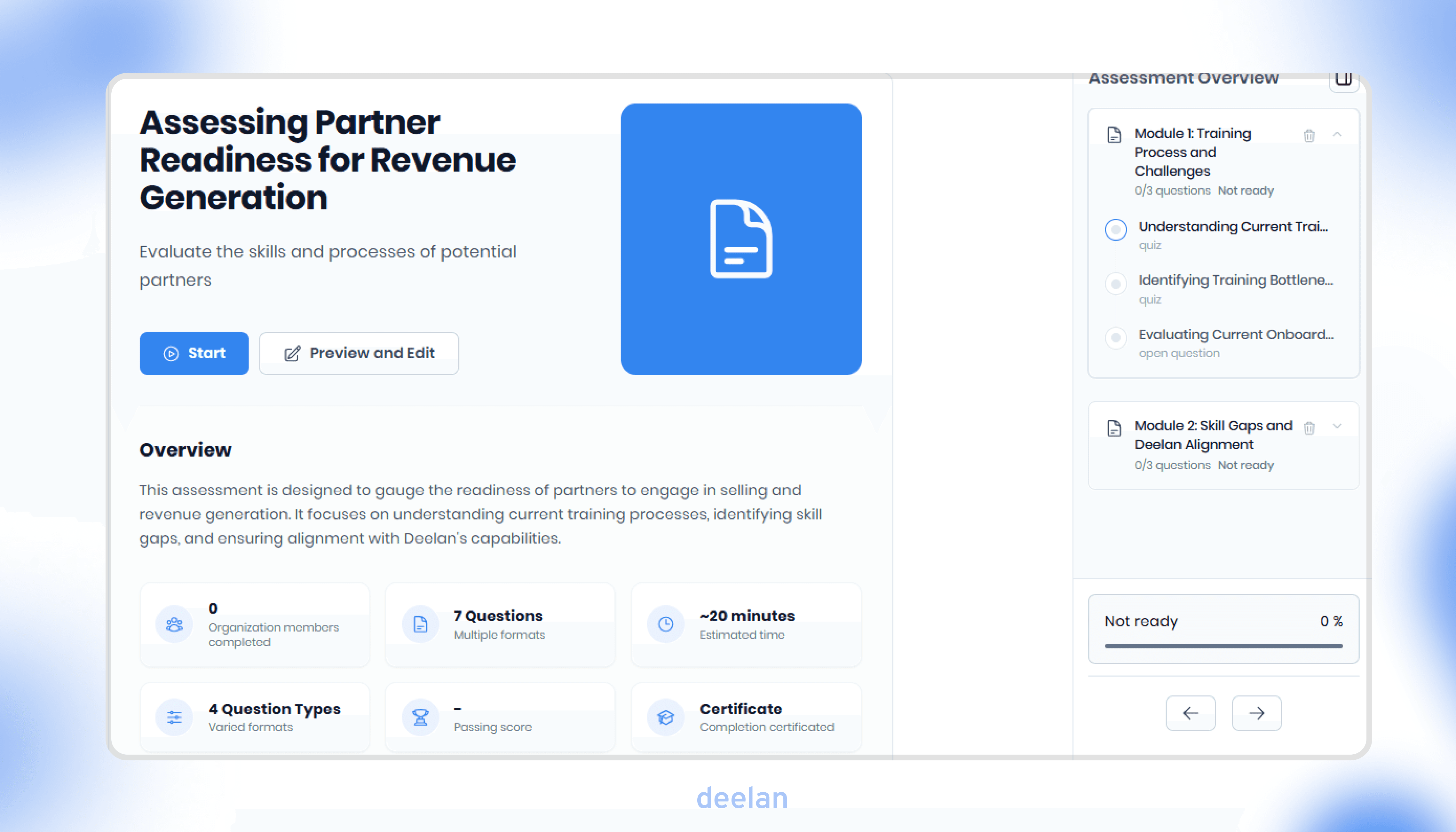Deelan helps revenue teams to convert existing sales materials into structured training quickly, assign adaptive learning paths across partner types and regions, and track readiness across the full partner base — without building everything from scratch or managing it through spreadsheets.
