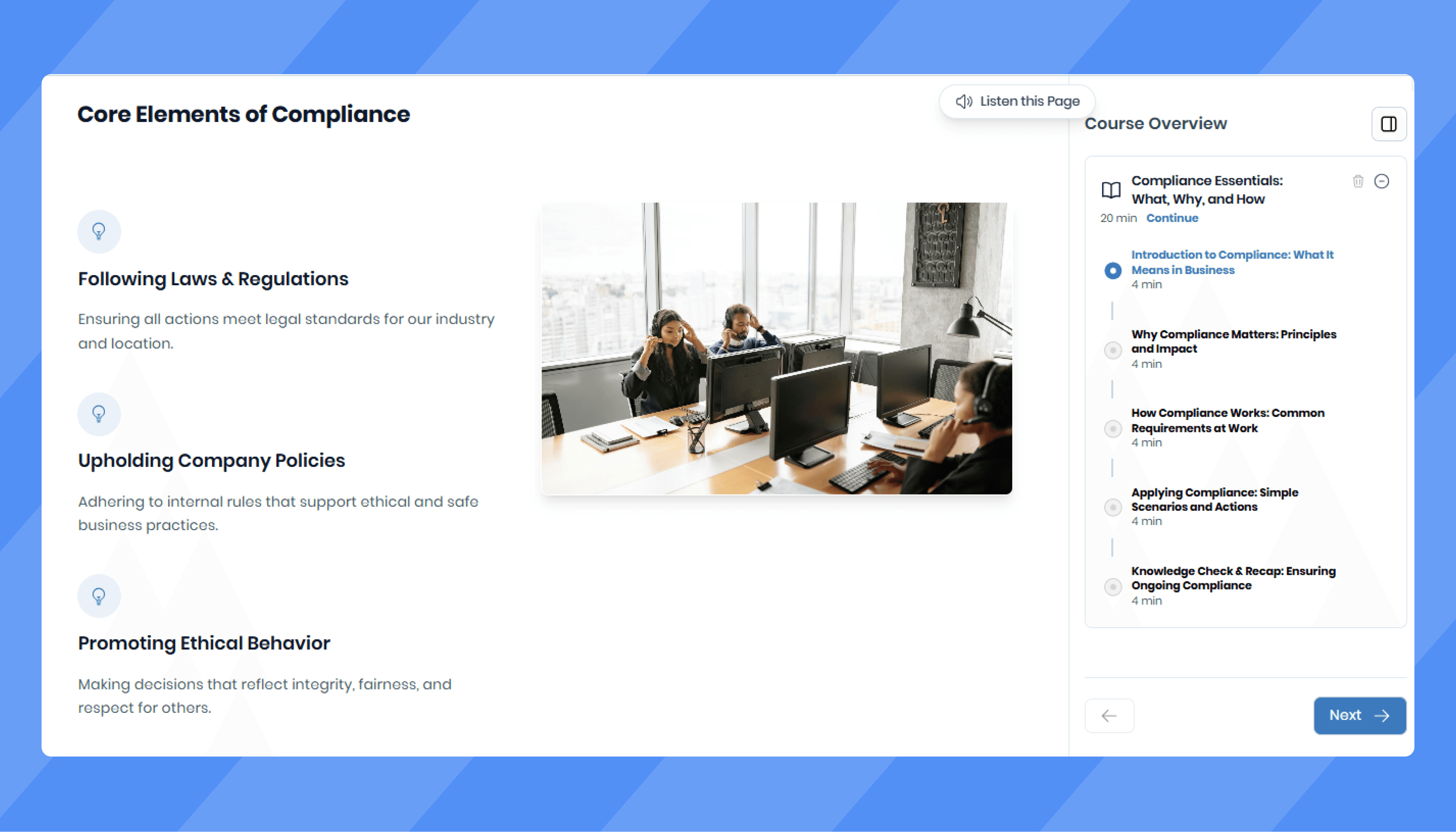 Learning Management System (LMS): The central hub for hosting content and tracking progress. Look for platforms that offer white labeling so the environment feels like your brand.