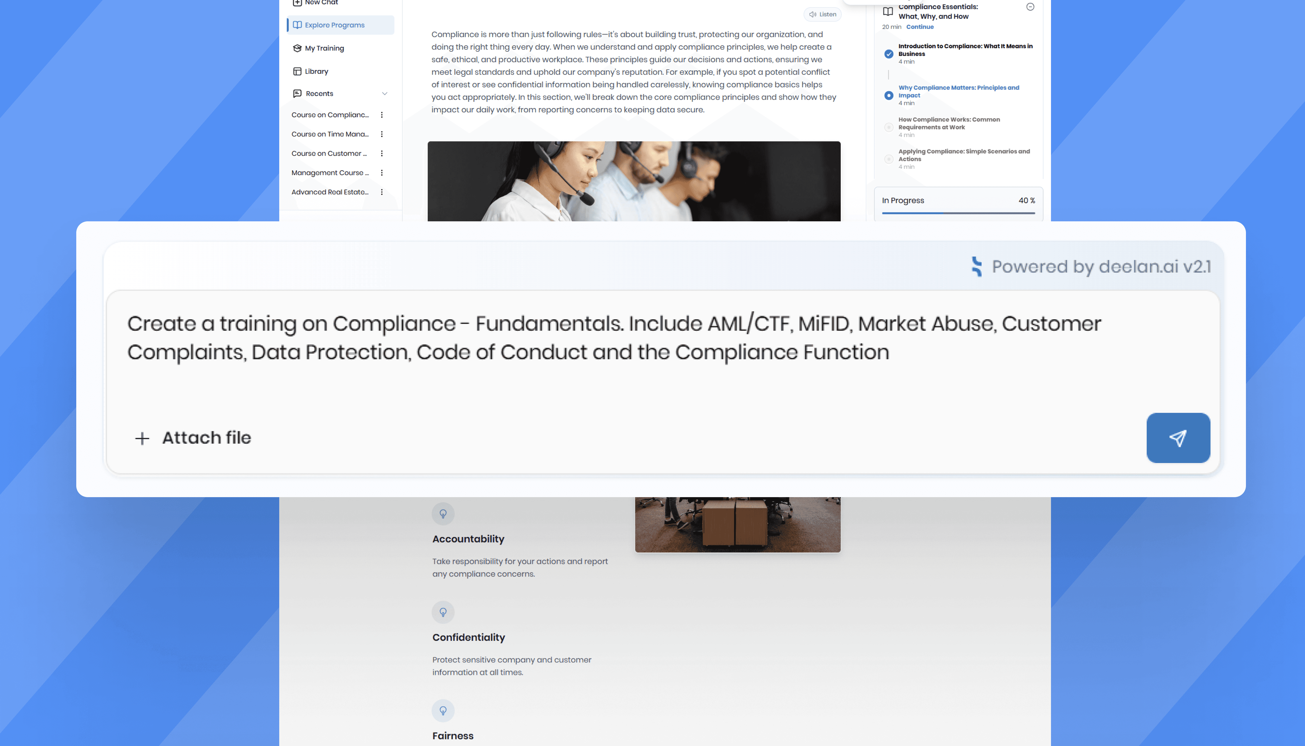 Deelan fits this approach with: Fast training generation (prompt-based or guided builder), Courses with quizzes for onboarding, compliance, and product knowledge, AI audio roleplays that analyze tone, clarity, strengths, and improvements, Progress tracking that shows who’s ready and who needs support, White labeling so training feels native to your company