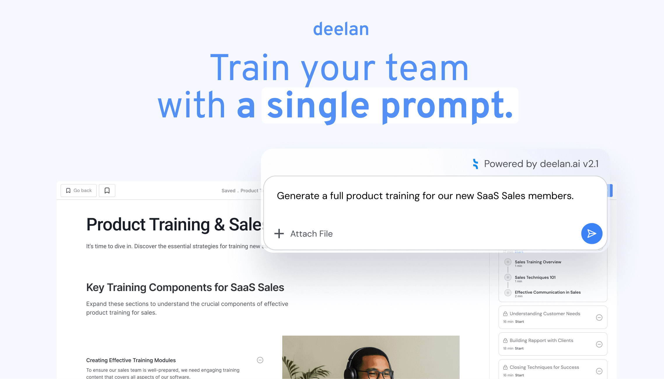 Deelan converts existing assets - scripts, recordings, messages, product docs - into structured training. This dramatically reduces enablement workload and accelerates onboarding creation.