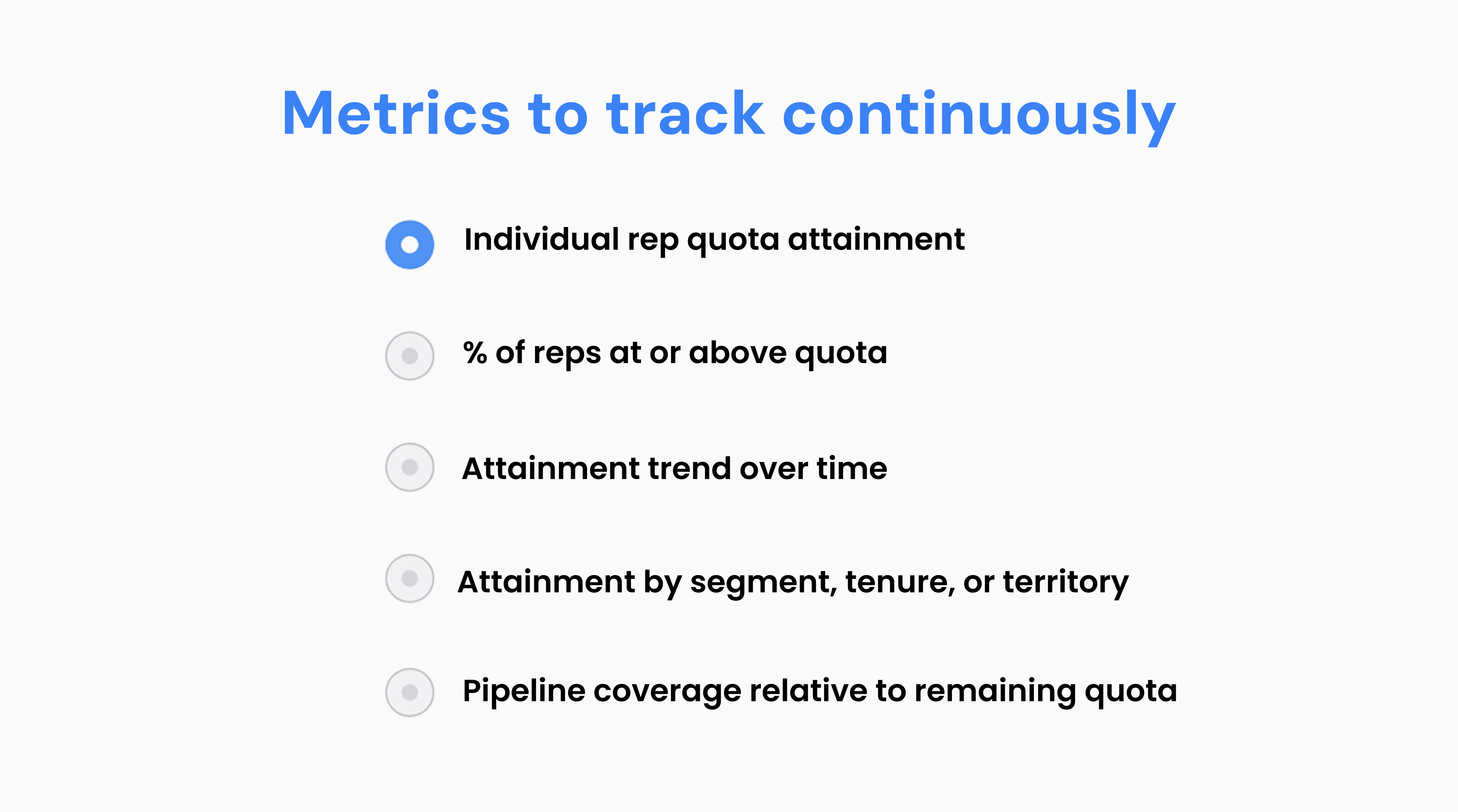 • Aim for 60–80% of reps to hit quota — if fewer hit, quota is likely too high; if more hit, it may be too low