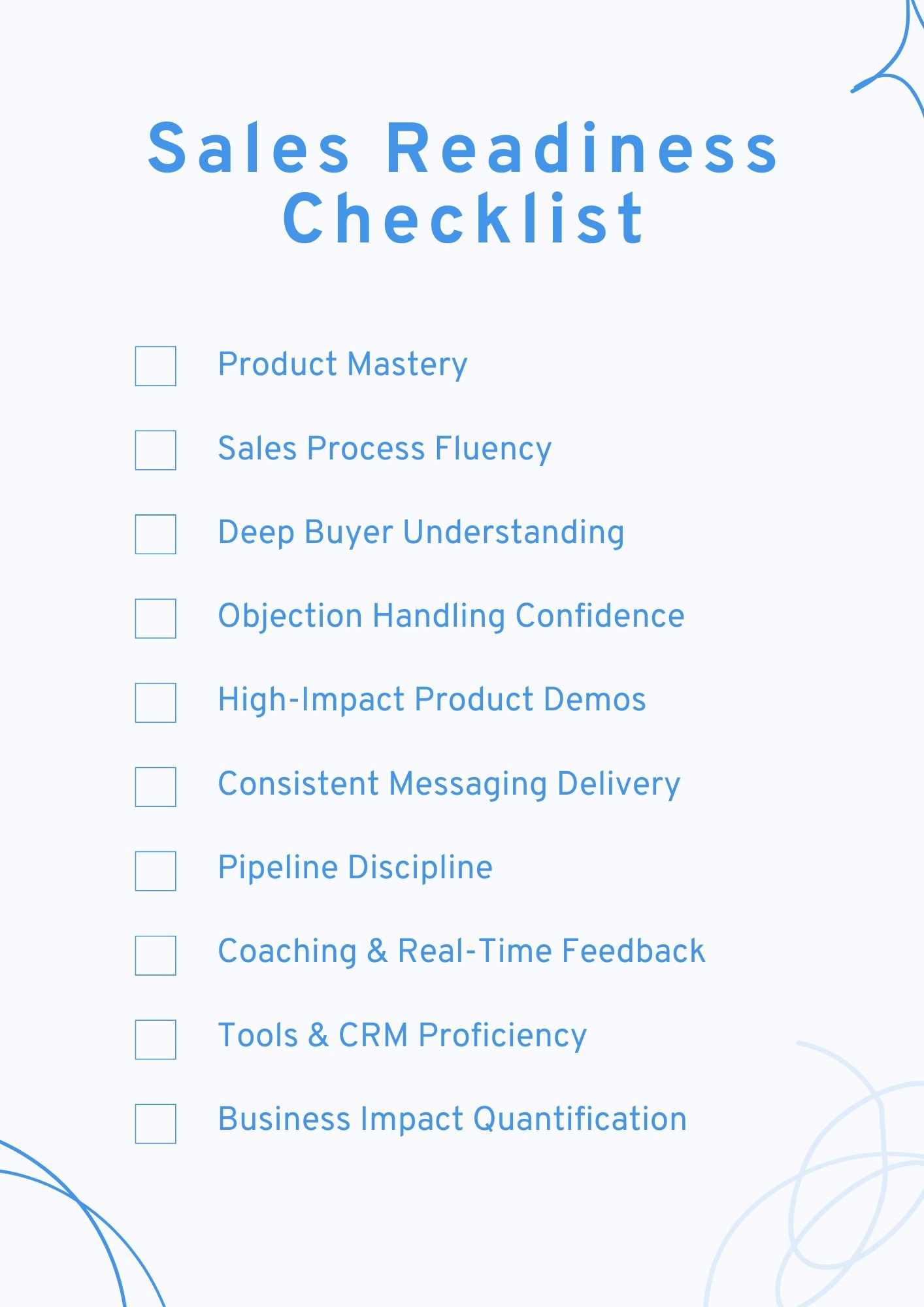 A sales-ready rep can demonstrate, on demand, that they can run a structured discovery call, build a CFO-ready business case, navigate a multi-stakeholder buying committee, and manage deals through the pipeline without needing a manager to rescue them at every turn.